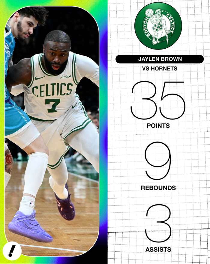 此役布朗全场比赛43分钟,29中13,三分10中3,罚球7中6,拿到35分9篮板3助攻1抢断1盖帽,命中率44.8%,三分命中率30%,真实命中率54.6%,正负值+9,美媒力挺布朗是MVP。本赛季布朗与塔图姆一同出战时,布朗场均能拿到28分,绿凯战绩11胜2负。